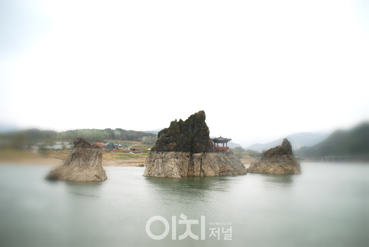가운데 장군봉(남편봉)을 중심으로 첩봉(딸봉)과 다소곳하게 돌아앉은 처봉(아들봉)이 흐르는 강물이 정지한 것처럼 강 한가운데 6m 높이에 수려하게 떠 있는 모습이 한 폭의 수묵화와 다름이 없다.