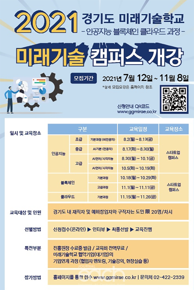 4차산업혁명 시대를 맞아 인공지능(AI), 블록체인 등 미래산업 육성에 박차를 가하고 있는 민선7기 경기도가 올해부터 ‘경기도 미래기술 캠퍼스’를 운영, 참여 교육생을 모집한다고 밝혔다.