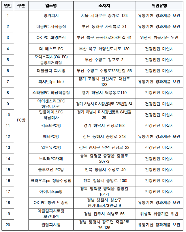 위반 장소별로는 ▲PC방(21곳) ▲키즈카페(7곳) ▲장례식장(5곳) ▲대형호텔(3곳) ▲동물카페(2곳) ▲결혼식장(1곳) 순이다.
