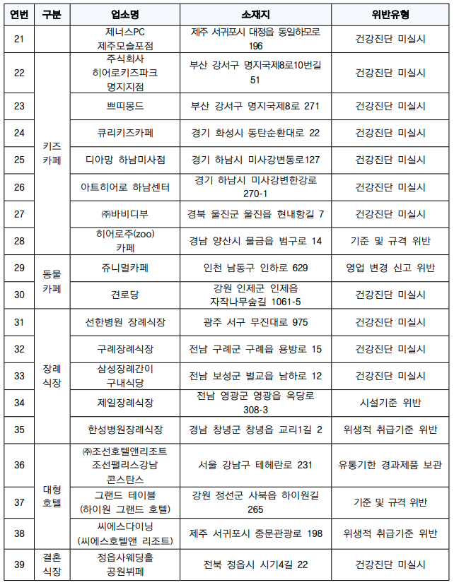 식품의약품안전처는 전국의 키즈카페, PC방, 동물카페, 만화카페, 스크린골프장, 결혼식장, 장례식장, 대형호텔 등에서 식품을 직접 조리‧판매하는 식품접객업소 총 3,881곳을 점검한 결과, 「식품위생법」을 위반한 39곳(1.0%)을 적발해 관할 기관에 행정처분을 요청했다.