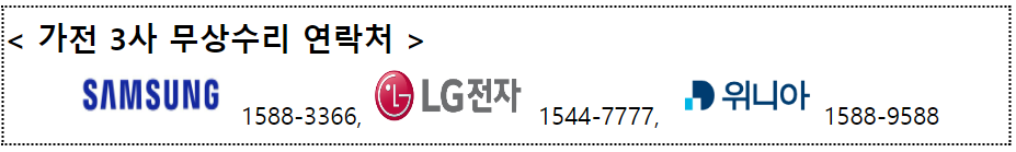 충북 괴산군‧충주시 외의 다른 지역에서도 이번 호우로 가전제품 피해를 입은 주민은 아래 가전3사로 연락하면 무상수리를 받을 수 있으며, 다른 지역에서도 수요신청을 받아 지원을 지속 확대해 나갈 예정이다.