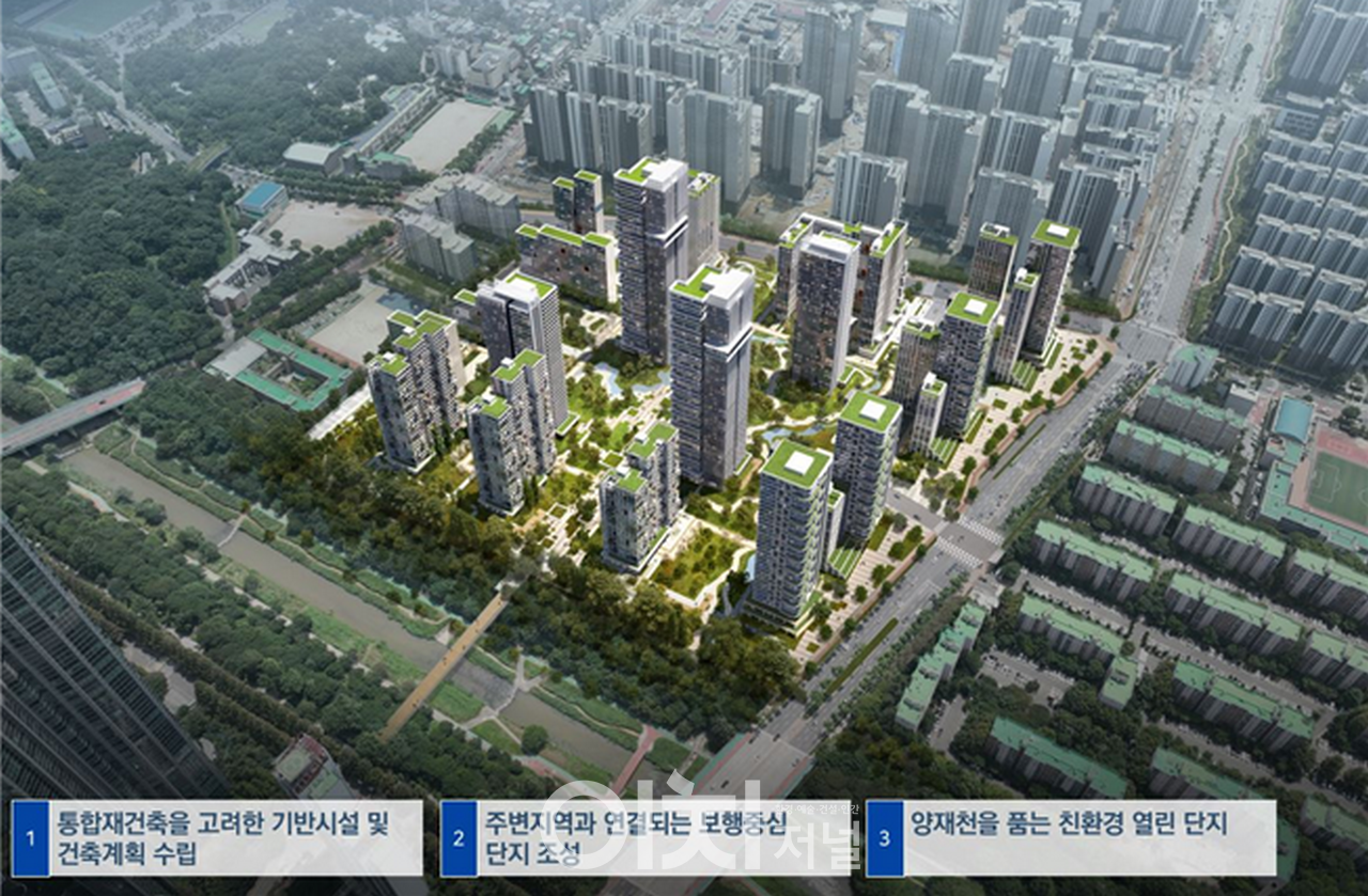 셋째, 양재천과 단지가 바로 맞닿아 있는 입지적 장점을 살려 양재천을 품을 수 있는 친환경 단지 배치를 계획했다. 양재천변 주동의 간격을 넓혀 공원이 단지 내 조경과 하나로 이어지는 열린 배치를 계획하고, 저층부에 개방형 주민공동 이용시설 등 수변특화공간 도입을 유도한다.
