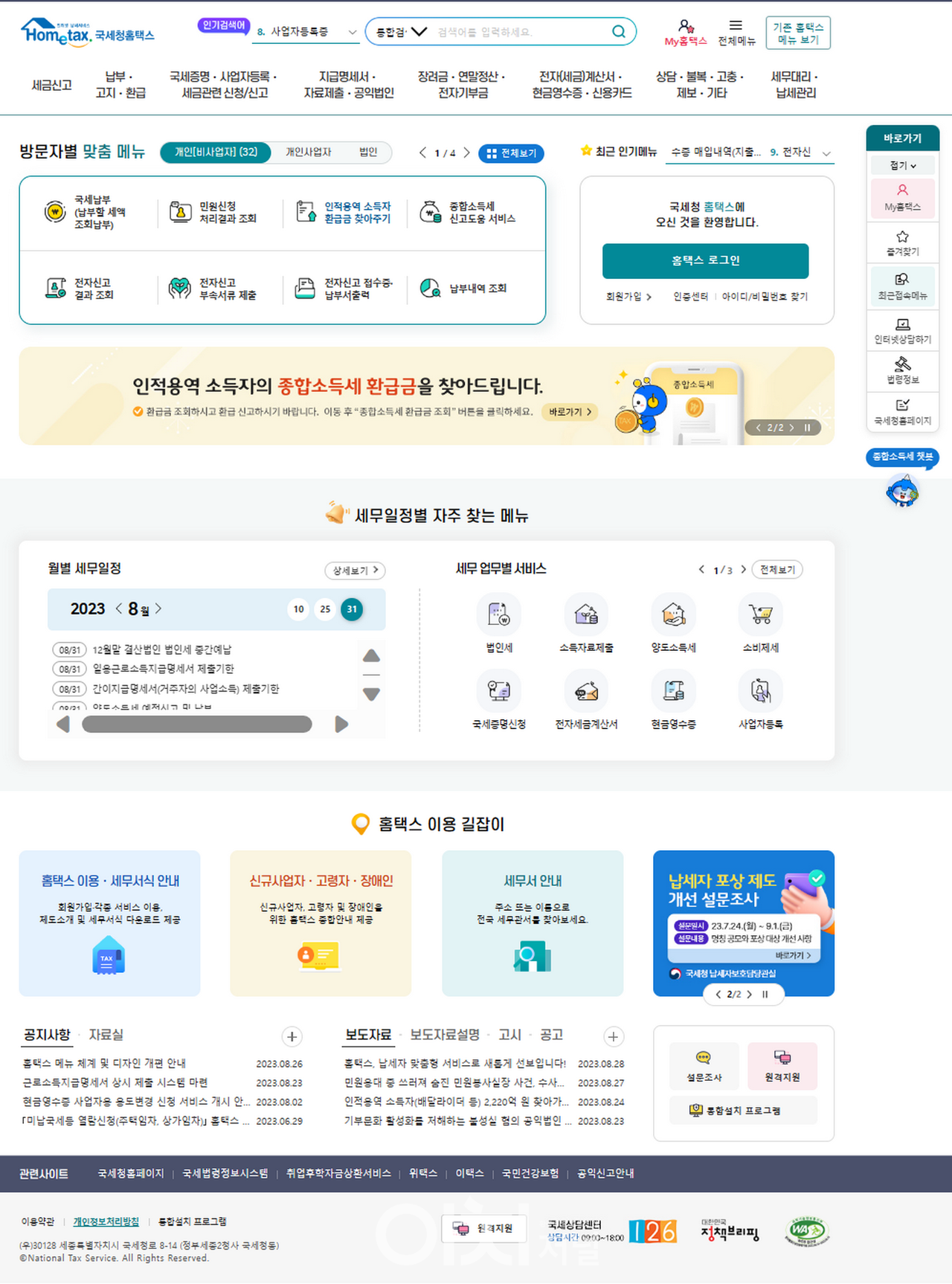로그인하면 납세자 유형별로 맞춤형 메뉴가 제시되고 세무일정별 메뉴 도입