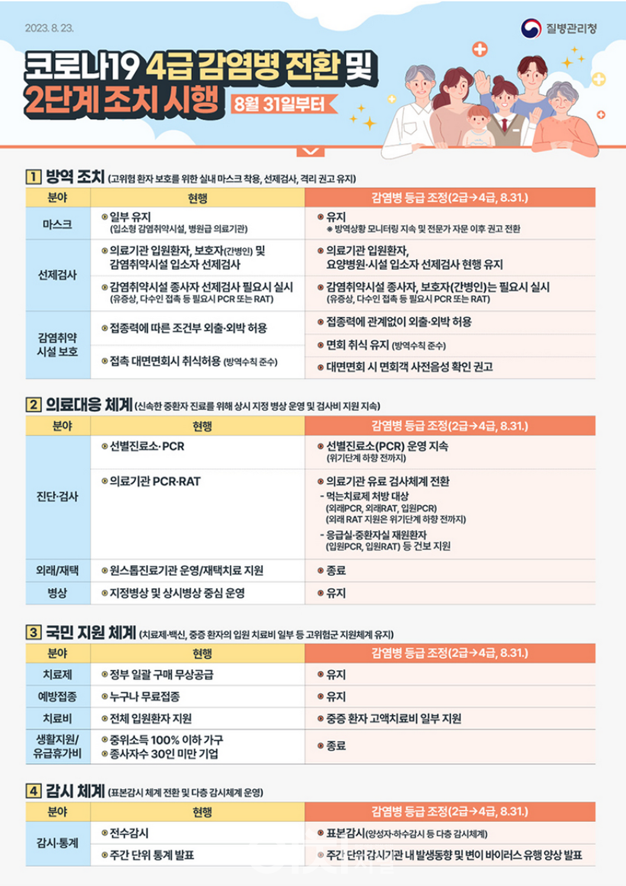 코로나19를 4급 감염병으로 하향하지만 감염 시 건강 피해가 큰 의료기관과 요양병원·시설 감염 관리를 위해 입원·입소 전 선제검사는 유지하고, 의료기관 입원 전 환자 및 상주 보호자, 감염취약시설 종사자 또한 필요시 검사받을 수 있도록 보건소 선별진료소를 통한 무료 검사 지원은 지속한다.