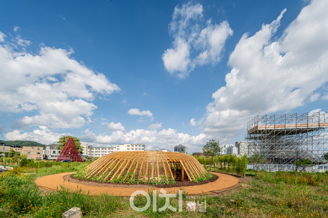 서울비엔날레 주제관인 ‘하늘소(所)’ 서쪽에 지름 18m, 높이 3m 규모로 들어선 <한옥 파빌리온 ‘짓다’>는 ‘바깥’이라는 불안한 외부 환경과 삶을 감싸고 보호하는 듯 안온한 ‘내부’ 공간이 대비되게끔 조성됐다.