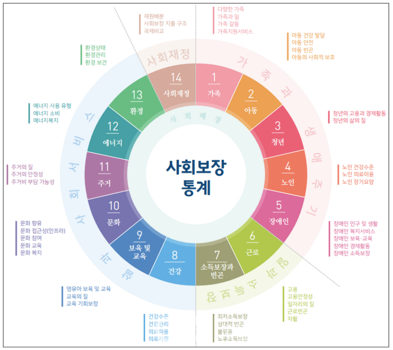 사회보장통계집은 ▲가족과 생애주기(가족, 아동, 청년, 노인, 장애인), ▲일과 소득보장(근로, 소득보장과 빈곤) ▲삶과 사회서비스(건강, 보육·교육, 문화, 주거, 에너지, 환경) ▲사회재정 등 4가지 범주, 14개 분야로 분류하여 국민의 삶과 사회보장을 총망라하였다.
