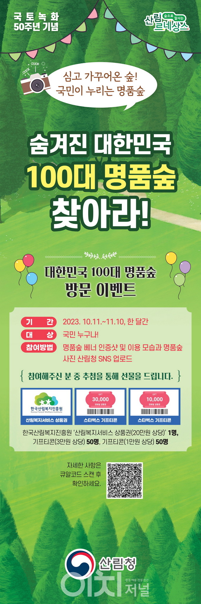 참여한 국민 중 추첨을 통해 1명에게 한국산림복지진흥원이 운영하는 숲체험시설 등에서 사용 가능한 20만 원 상당의 산림복지서비스이용권을, 50명에게는 3만 원 상당의 기프티콘을, 50명에게는 1만 원 상당의 기프티콘을 제공할 예정이다.