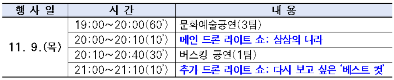 10월 27일(금)부터 11월 1일(수)까지 공식 인스타그램(@seouldroneshow_official)을 통해 다시 보고 싶은 회차별 최고의 장면을 추천받았고, 이를 재구성해 특별 공연으로 선보인다.