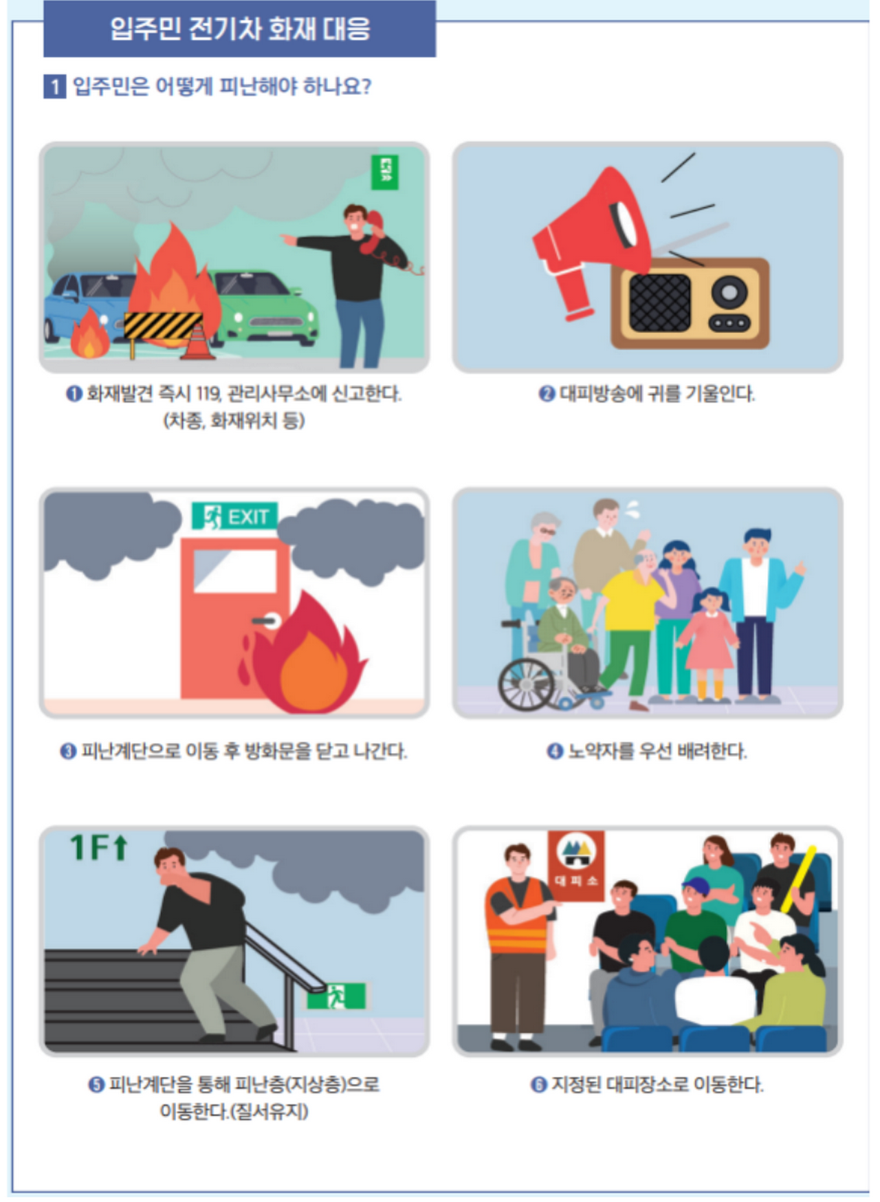 ‘화재 대응체계 구축’ 편은 평상시 행동요령으로 충전・소방・안전시설 등에 대한 현황 파악 및 체크리스트를 통한 점검 및 관리, 화재 대비 대응조직 구성 및 역할 분담 등 화재 예방 및 대비에 중점을 두었으며, ‘화재 대응운영 및 관리’ 편은 화재 발생 시 관리사무소, 입주민 등이 쉽게 이해하고 따라할 수 있도록 사진, 삽화 등 활용하여 화재 단계별 대응요령을 제시하는 한편, 충전으로 인한 화재피해를 최소화하고자 충전구역 위치지정 시 고려사항도 같이 수록하였다.