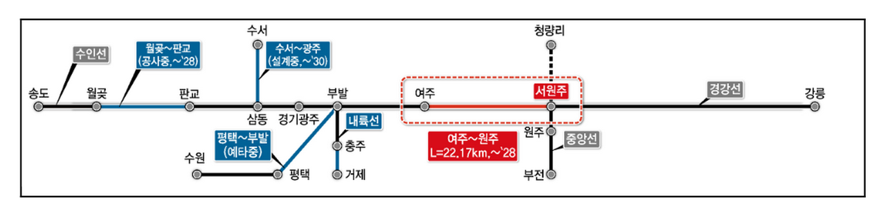 여주~원주 복선전철 건설사업은 여주역에서 서원주역까지 22.2km의 경강선 구간을 연결하는 사업으로, 총 사업비 약 9,309억원을 투입하여 ’28년 개통을 목표로 추진된다.