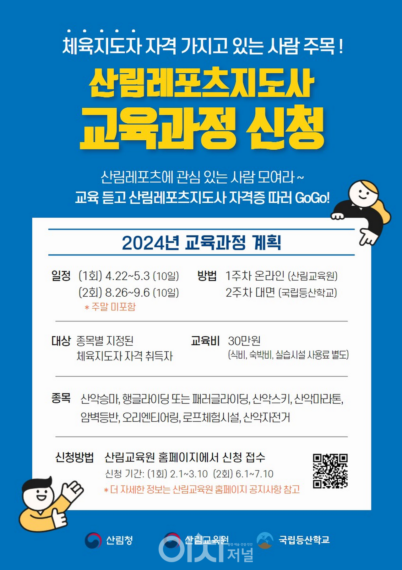 이번 1회차 교육과정은 오는 4월 22일부터 5월 3일까지 2주 동안 이루어지며, 교육 신청은 2월 1일부터 3월 10일까지 산림교육원 누리집(http://fhi.forest.go.kr)에서 신청하면 된다. 기타 자세한 사항은 산림교육원(031-570-7442)으로 문의