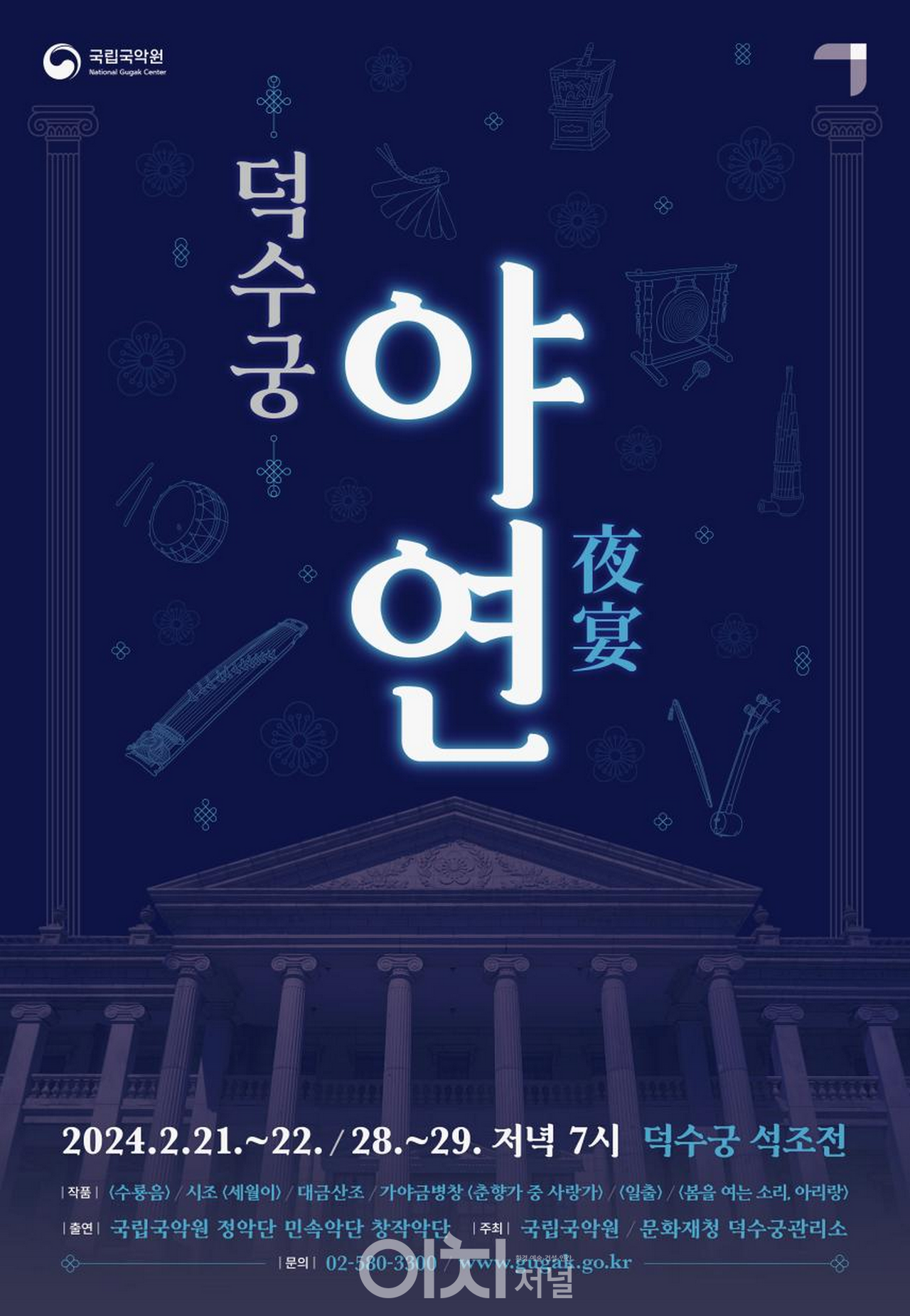 문화재청 궁능유적본부 덕수궁관리소(소장 권점수)는 오는 2월 21~22일과 28~29일 4일간 오후 7시 덕수궁 석조전(서울 중구)에서 국립국악원(원장 김영운)과 함께 국악 공연 ‘덕수궁 야연(夜宴)’을 개최한다.