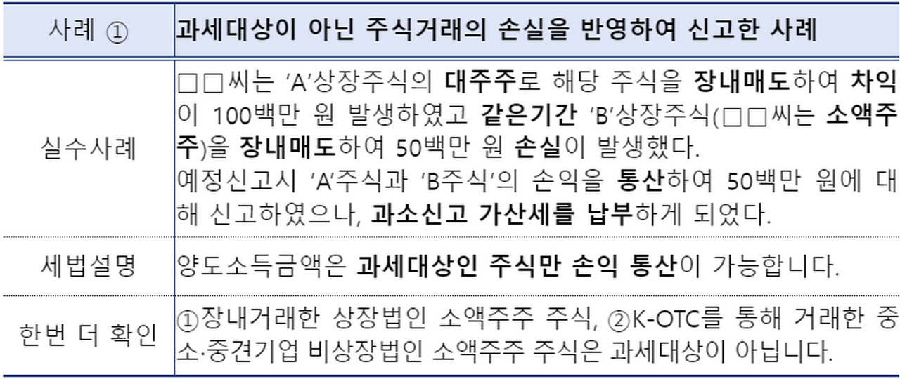 거래횟수 3회 이내로 주식을 양도한 납세자가 양도소득과 세액을 한 화면에서 손쉽게 신고할 수 있도록 주식 양도소득세 간편신고 서비스를 제공하며, 주식 양도세 신고 시 자주 실수하는 신고사례에 대한 유의사항을 홈택스 신고서 작성 시 한 번 더 안내하고 있으므로 과소신고 가산세 등 불이익을 받지 않도록 신고서 제출 전 미리 확인해야 한다.