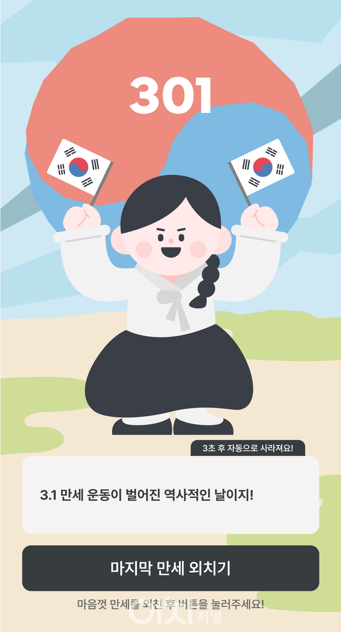 또한, 게임 결과 화면을 통해 참여자가 거주하고 있는 지역 출신의 독립운동가를 소개함으로써, 그간 잘 알지 못했던 지역의 독립운동가를 알리는 것에도 중점을 뒀다. 여기에 특정 만세 횟수를 달성할 때마다 3·1운동과 관련된 메시지나 만세운동에 동참하고 있는 참여자를 응원하는 메시지가 표출되도록 했다.