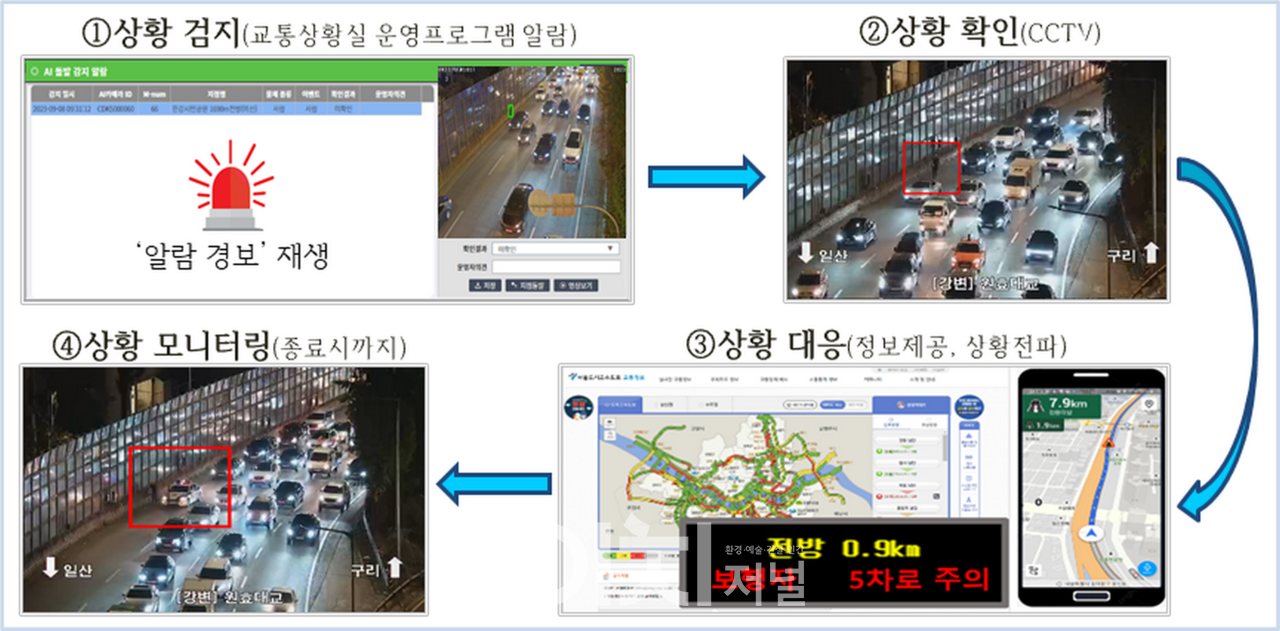 AI영상검지기는 교통정보(교통량, 속도) 수집과 동시에 사람, 정지차량, 역주행 차량 등을 검지하여 10초 이내에 도시고속도로 교통관리센터 상황실에 알려주며, 상황실은인지즉시 경찰등 유관기관에 상황을 전파하고 도로전광표지, 내비게이션 및 홈페이지 등에 돌발 정보를 제공하고 있다.