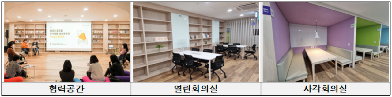 시민들은 회의 규모와 사용 목적에 따라 다양한 ‘대관공간’을 이용할 수 있다. 센터는 공간개선 후 현재 ▲다목적홀(1실, 100인) ▲회의실(6실, 8~16인) ▲미디어실(1실, 영상회의 등) 등 4종류 총 8개의 대관공간을 운영 중이다.
