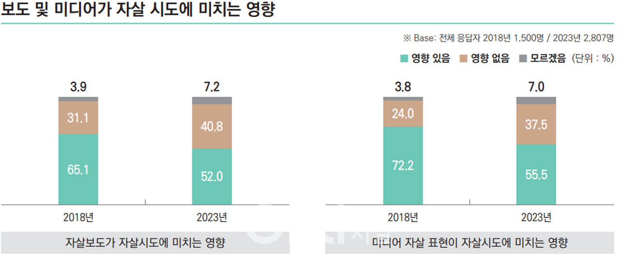 자살 보도 및 미디어의 자살 표현을 접한 자살생각 미경험자와 유경험자 모두 ‘자살이 사회적인 문제라고 느낌’에 응답한 비율은 각각 50.6%, 51.4%로 가장 높게 나타났으며, 자살생각 유경험자는 ‘기분이 우울해졌다’, ‘자살보도로 자살하는 사람이 늘어나지 않을까 하고 불안하게 느꼈다’ 등 부정적인 항목에 대한 응답비율이 미경험자에 비해 높았다.
