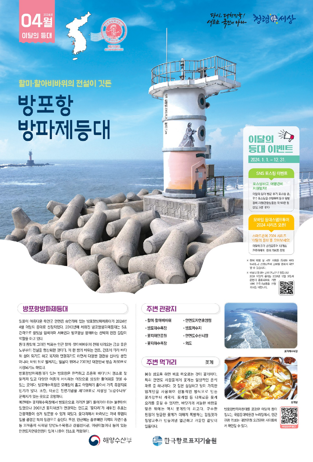 충청남도 태안군 안면읍에 있는 ‘방포항방파제등대’가 4월 이달의 등대로 선정되었다. 2013년에 세워진 방포항방파제등대는 5초 간격으로 불빛을 깜빡이며 서해안과 방포항을 항해하는 선박의 안전 길잡이 역할을 하고 있다.