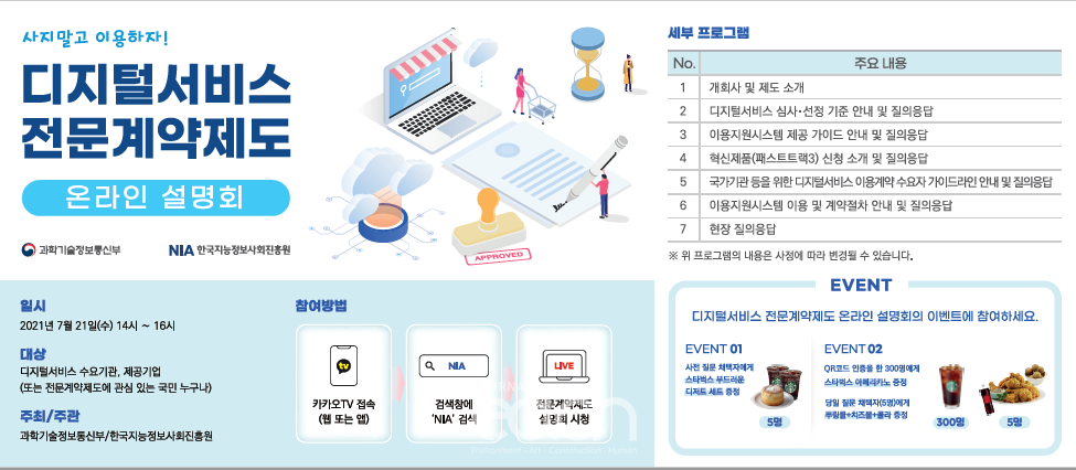 과학기술정보통신부(이하 ‘과기정통부’)는 7월 21일 디지털서비스 제공기업(이하 ‘제공기업’)과 이용을 원하는 기관(국가·공공기관 및 지방자치단체, 이하 ‘이용기관’)을 대상으로 디지털서비스 전문계약제도 온라인 설명회(카카오 TV NIA 채널)를 개최한다고 밝혔다.