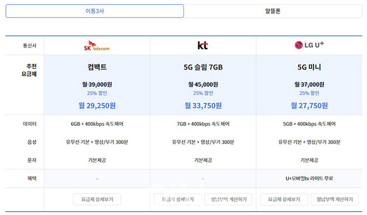 아울러 기본 요금제는 물론 절약형 요금제, 여유형 요금제 등도 통신 3사별로 안내하며 알뜰폰의 경우에도 이같은 내용으로 확인할 수 있다.