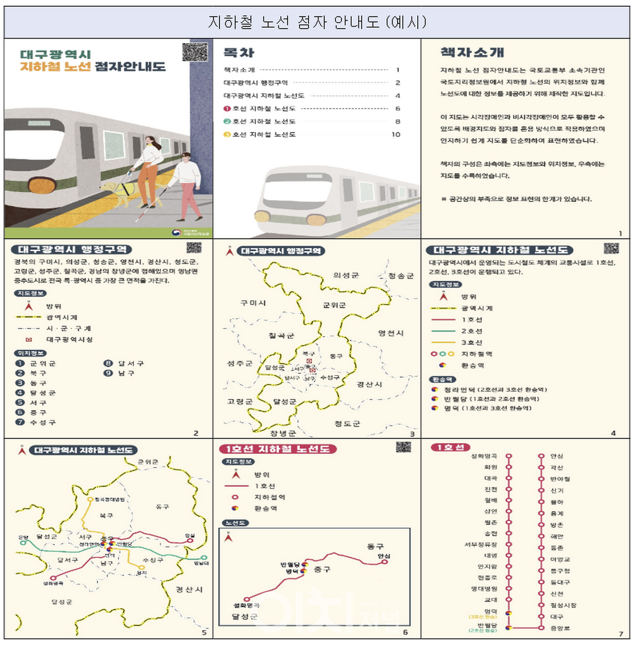 지하철 노선 점자안내도는 시각장애인의 이동편의를 지원하고 올바른 공간정보 전달과 차별없는 서비스 제공을 목적으로 행정구역 및 주변행정경계 등의 위치정보와 지하철 노선정보 등을 점자기호와 점자주기로 표현하였다.