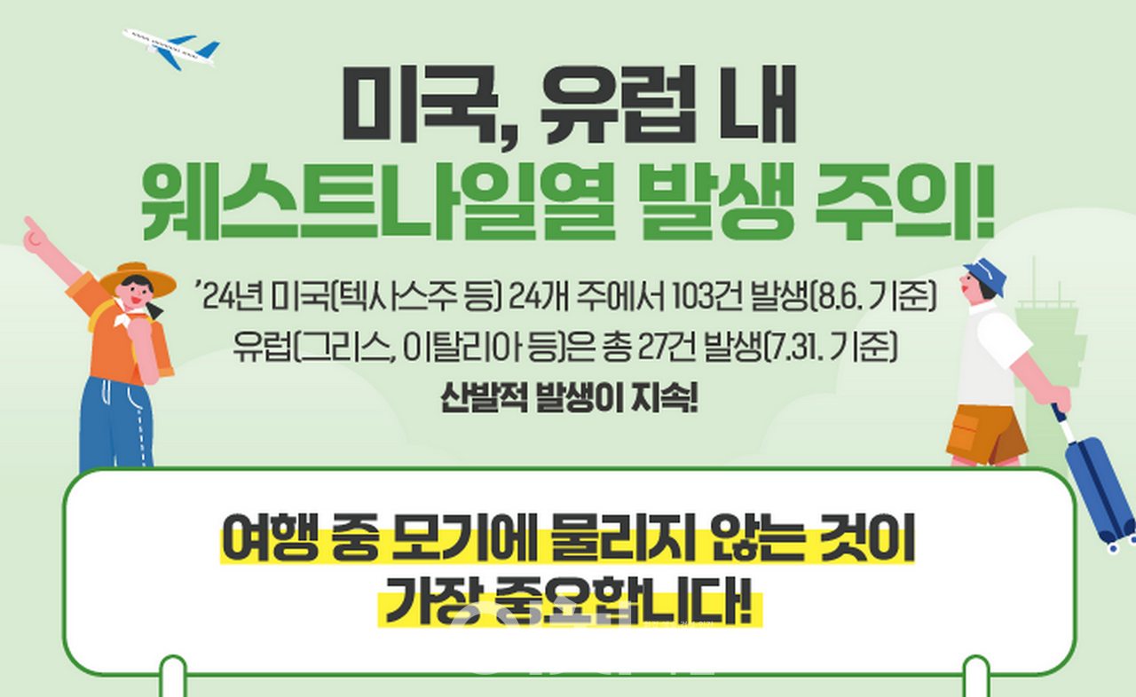 미국과 유럽에서 웨스트나일열이 발생함에 따라 여행 시 모기물림으로 인한 모기 매개 감염병에 대해 주의가 필요하다.