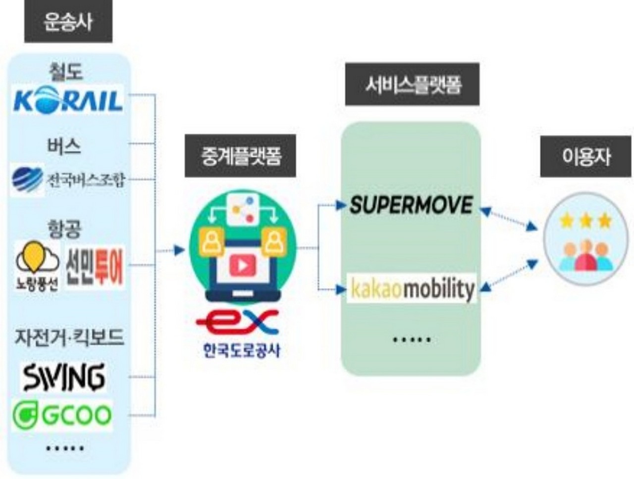 이번 K-MaaS 서비스의 중계 플랫폼은 한국도로공사가 맡아 철도(코레일), 항공(노랑풍선·선민투어), 시내버스(TAGO), 시외버스(버스연합회), 개인형 이동수단(지바이크) 등 주요 운송수단의 실시간 정보를 통합하여 제공한다. 이를 기반으로 민간 플랫폼 사업자인 슈퍼무브는 사용자 중심의 통합 앱을 개발, 서비스하게 되었다.