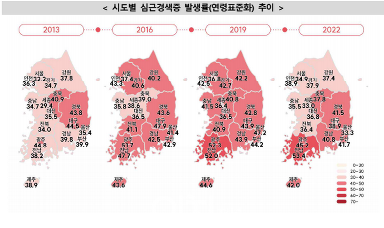 심근경색증의 연령표준화 발생률은 2012년 36.2건에서 2022년 38.6건으로 6.6% 증가했지만, 2020년 이후로는 감소세를 보이고 있다. 지역별로는 전남(53.4건/10만 명당)과 광주(45.2건/10만 명당)가 가장 높았으며, 세종(33.0건/10만 명당)과 울산(33.3건/10만 명당)이 가장 낮았다.