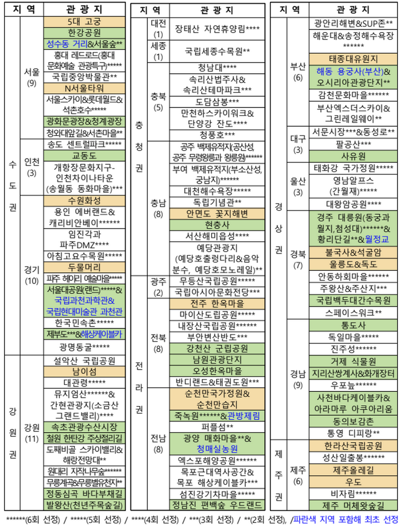 뿐만 아니라 대구 사유원, 정동심곡 바다부채길 등 힐링 트렌드를 반영한 치유 여행지와 전통 한옥의 멋을 간직한 전주 한옥마을, 제주올레길처럼 한국의 풍경을 대표하는 스테디셀러도 꾸준히 사랑받으며 7회 연속 선정되는 쾌거를 이뤘다.
