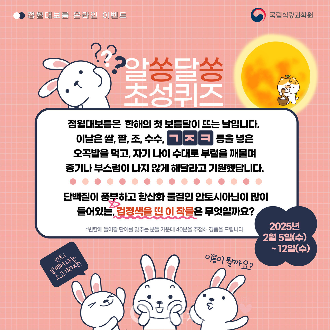 농촌진흥청이 정월대보름을 맞아 온라인 퀴즈 행사를 진행한다. 이번 행사는 2월 5일부터 12일까지 진행되며, 참여자 중 40명을 추첨해 '식냥이' 굿즈와 우리 품종 쌀 세트를 증정한다. 자세한 내용은 국립식량과학원 누리집과 기관 SNS에서 확인할 수 있다.