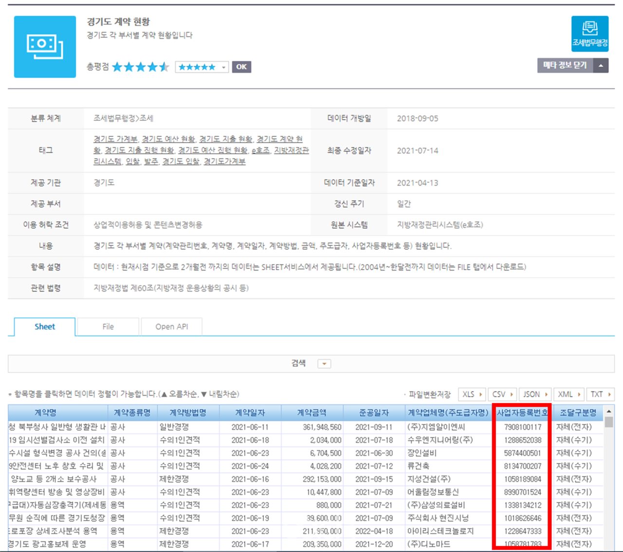 경기도는 2004년부터 체결된 경기도 계약데이터와 2015년부터 지출된 데이터 등 약 613만 건을 사업자등록번호를 포함해 개방했으며 현재는 로컬푸드 인증정보 현황, 공방사업자 현황 등 총 6개 데이터를 사업자등록번호를 포함해 개방하고 있다.