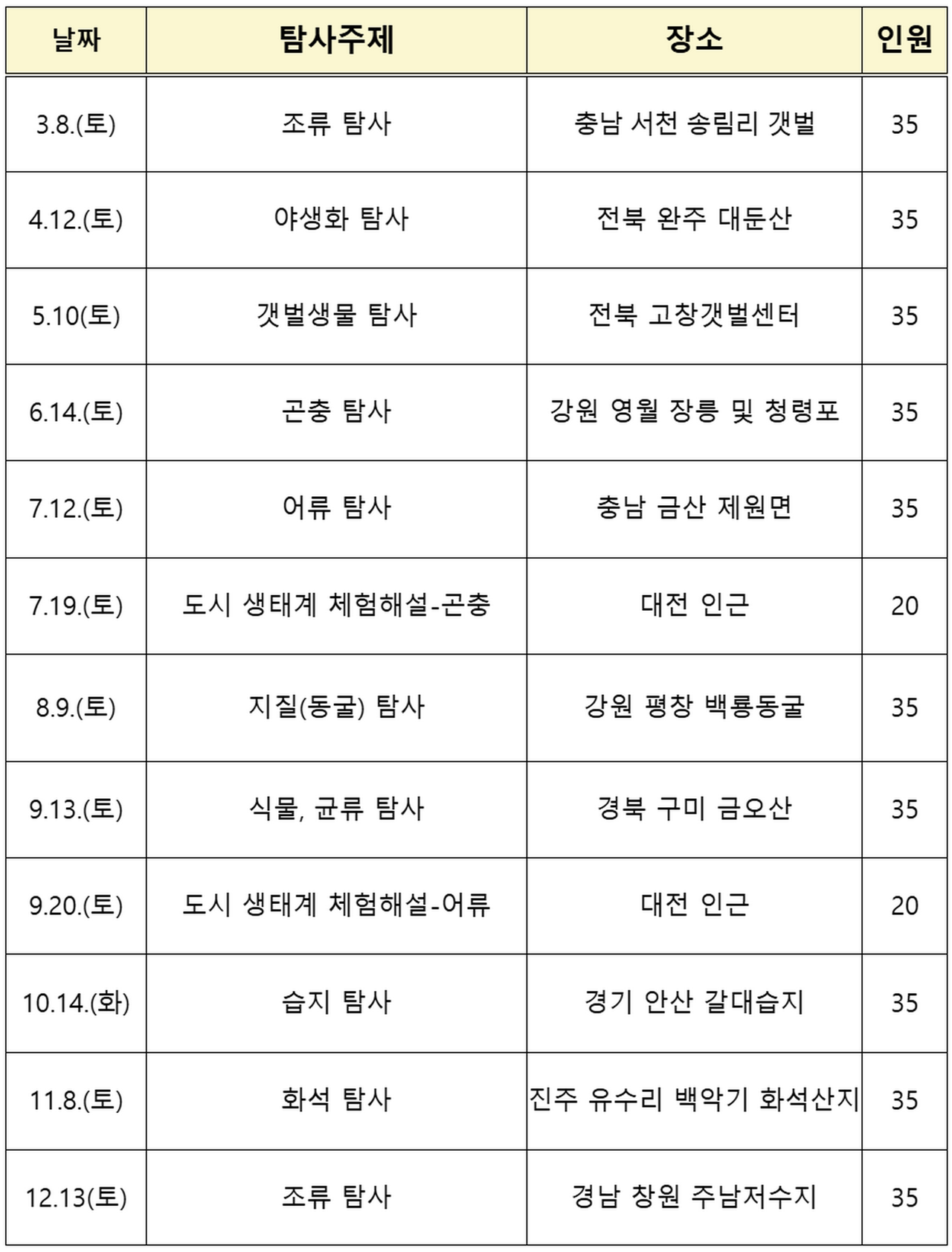 자연을 체험하는 활동은 어린이들만의 전유물이 아니다. 자연에 대한 호기심을 가진 성인이라면 누구나 참여할 수 있는 이 프로그램은 3월부터 시작되며 연간 12회에 걸쳐 진행된다. 3월에는 조류 탐사가, 이후에는 갯벌, 곤충, 어류, 동굴 탐사 등 다양한 테마로 자연을 깊이 있게 탐구하는 기회가 주어진다. 특히 7월과 9월에는 도심 속 자연생태계를 살펴보는 특별 프로그램이 추가되어 인간이 만든 환경 속에서 살아가는 생물들의 상호작용을 직접 확인할 수 있다.