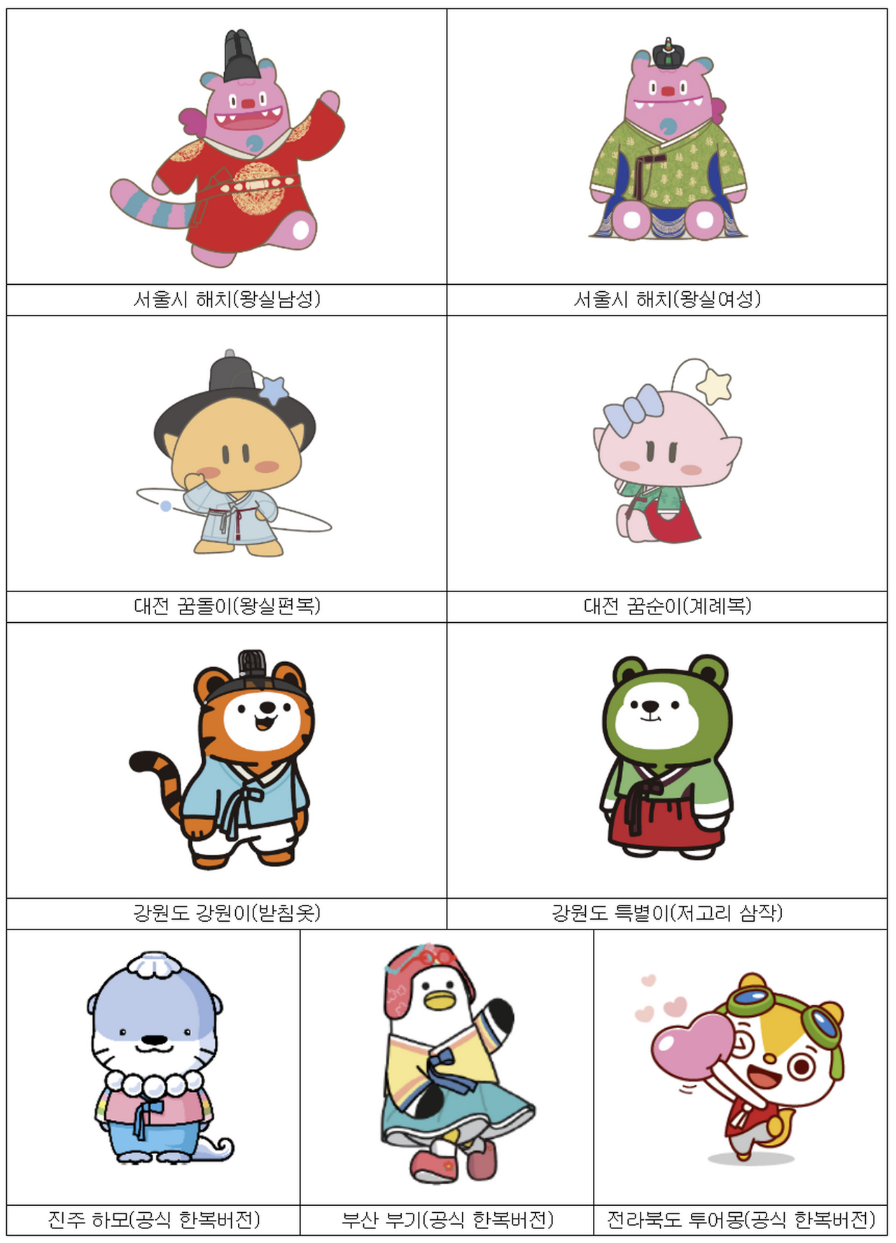 지역의 상징 마스코트들도 한복을 차려입고 귀성객 맞이에 나선다. 서울의 ‘해치’, 대전의 ‘꿈돌이와 꿈순이’, 강원의 ‘강원이와 특별이’, 부산의 ‘부기’, 진주의 ‘하모’, 전북의 ‘투어몽’ 등이 한복을 입은 이미지로 제작돼 공개된다. 특히 서울도서관 광장과 서울공예박물관 앞마당에는 왕실 한복 차림의 대형 ‘해치’ 풍선 모형이 설치돼 가족 단위 방문객의 발길을 끌 전망이다.