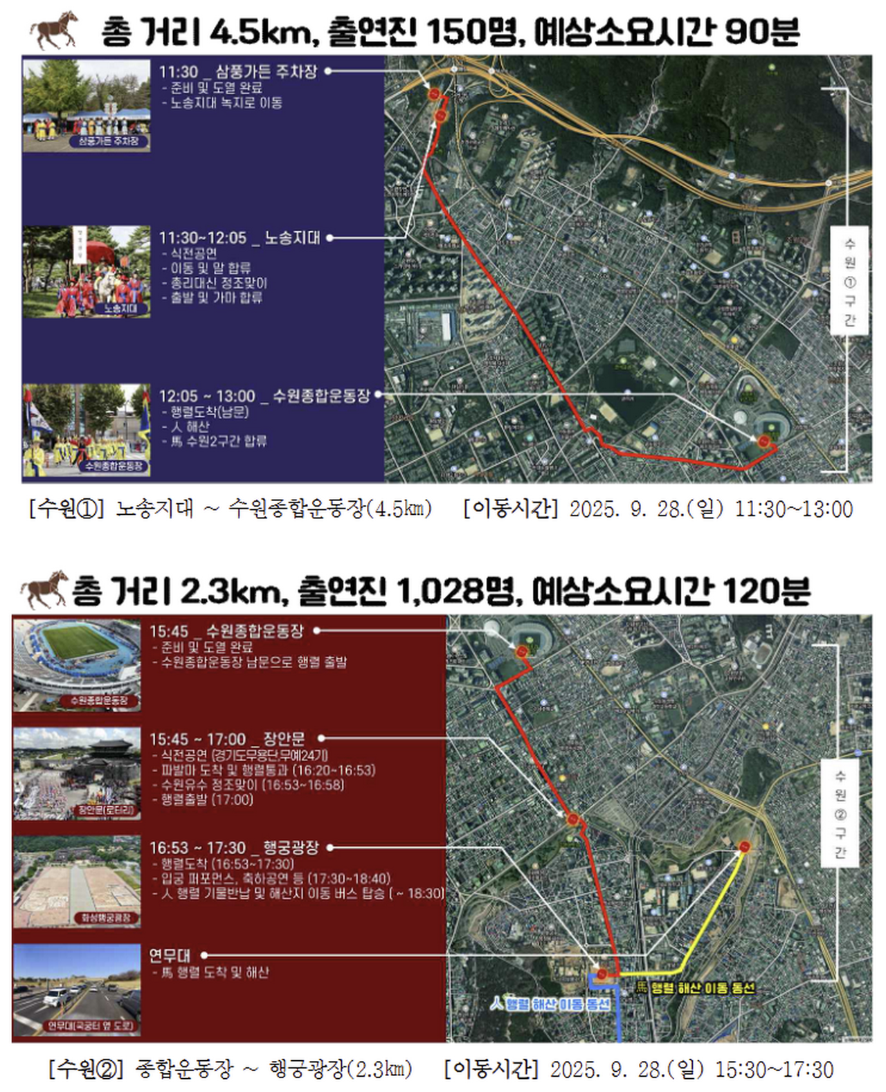 길 위에서는 덕수궁 환영 의식, 서울역 엿장수 공연, 숙대입구역 사자놀이, 삼각지역 풍물패, 용산역 취타대 등 다채로운 거리 퍼포먼스가 이어져 축제 분위기를 더욱 고조시킨다. 서울 구간은 경복궁~노들섬과 금천구청~시흥5동 주민센터로 나뉘어 총 1,600여 명과 말 20필이 행렬을 이끌고, 수원 구간에서는 2,300여 명과 말 110여 필이 안양에서 수원까지 퍼레이드를 재현한다.