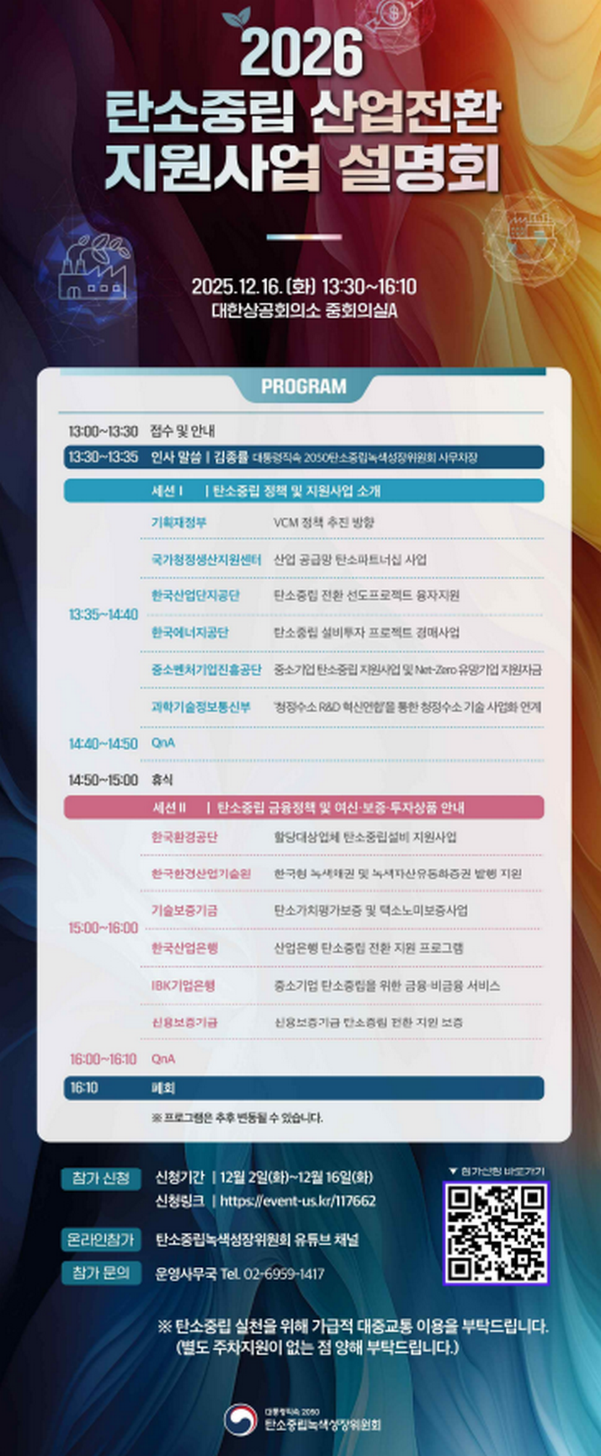 참석을 원하는 기업은 12월 16일까지 행사 포스터의 QR코드 또는 신청 링크(event-us.kr/117662)를 통해 사전 등록해야 하며, 현장 참여가 어려운 기업을 위해 ‘2050탄소중립녹색성장위원회’ 유튜브 채널에서 실시간 중계도 제공된다.