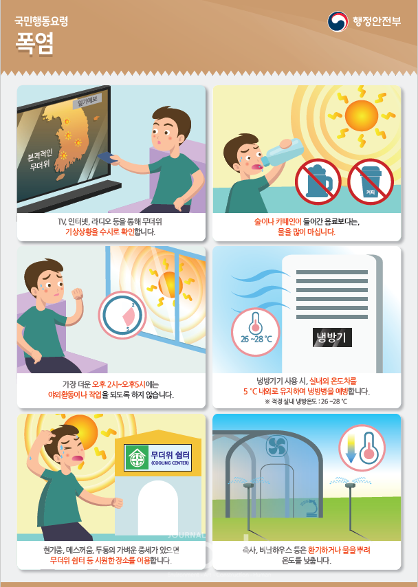행정안전부는 최근 무더위 날씨가 지속되고, 폭염이 더욱 기승을 부리고 있어 더위로 인한 온열질환에 주의를 요청하였다.