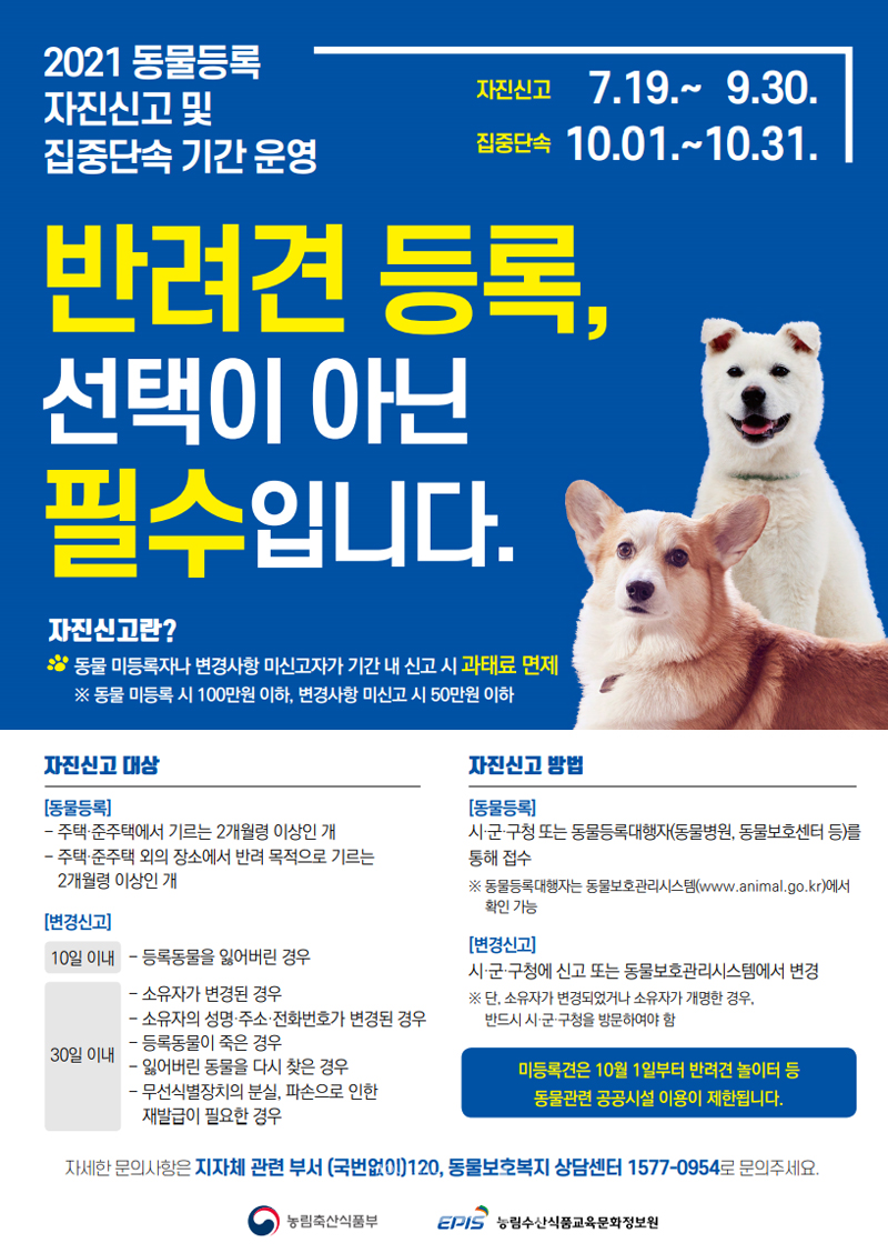 이번 동물등록 자진신고에 대한 자세한 사항은 동물보호관리시스템 홈페이지(www.animal.go.kr)를 참고하거나, 경기도내 시군 동물보호 담당부서로 문의하면 된다.