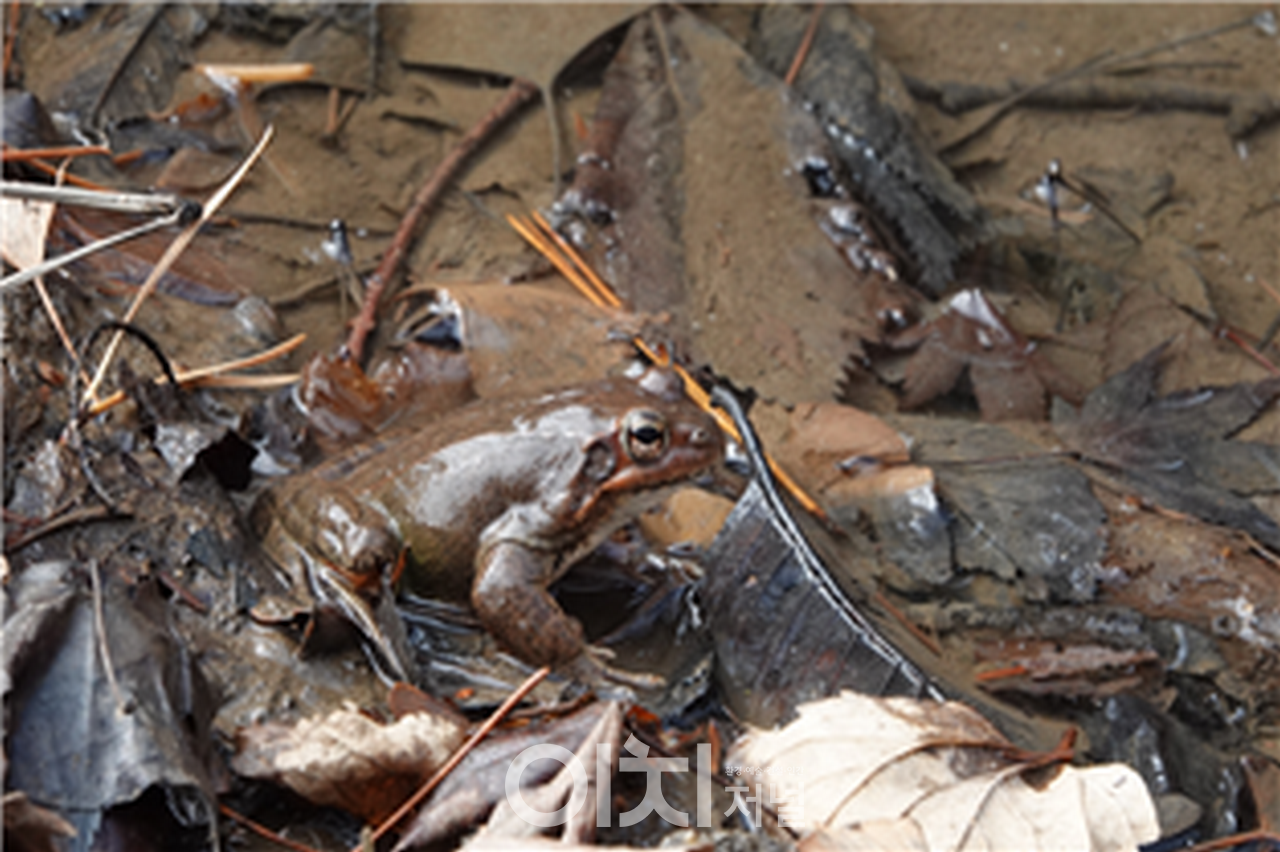 절기상 개구리가 겨울잠에서 깬다는 경칩(양력으로 3월 6일)을 맞아 남산에 서식하는 큰산개구리가 동면에서 깨어나 본격적인 산란을 시작했다고 서울특별시 중부공원여가센터가 봄소식을 전했다.
