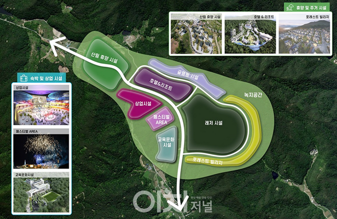 복합휴양단지에는 시민들이 즐길 수 있는 골프장 등 레저시설, 호텔, 리조트, 고급 타운하우스, 산림휴양시설 등 약 200만㎡의 면적에 사업 규모는 대략 2,000억 원(부지매입비, 대지조성비용) 정도이며, 신공항 개항과 더불어 공항도시를 대비한 국제적인 규모의 관광휴양시설로 조성할 계획이다.