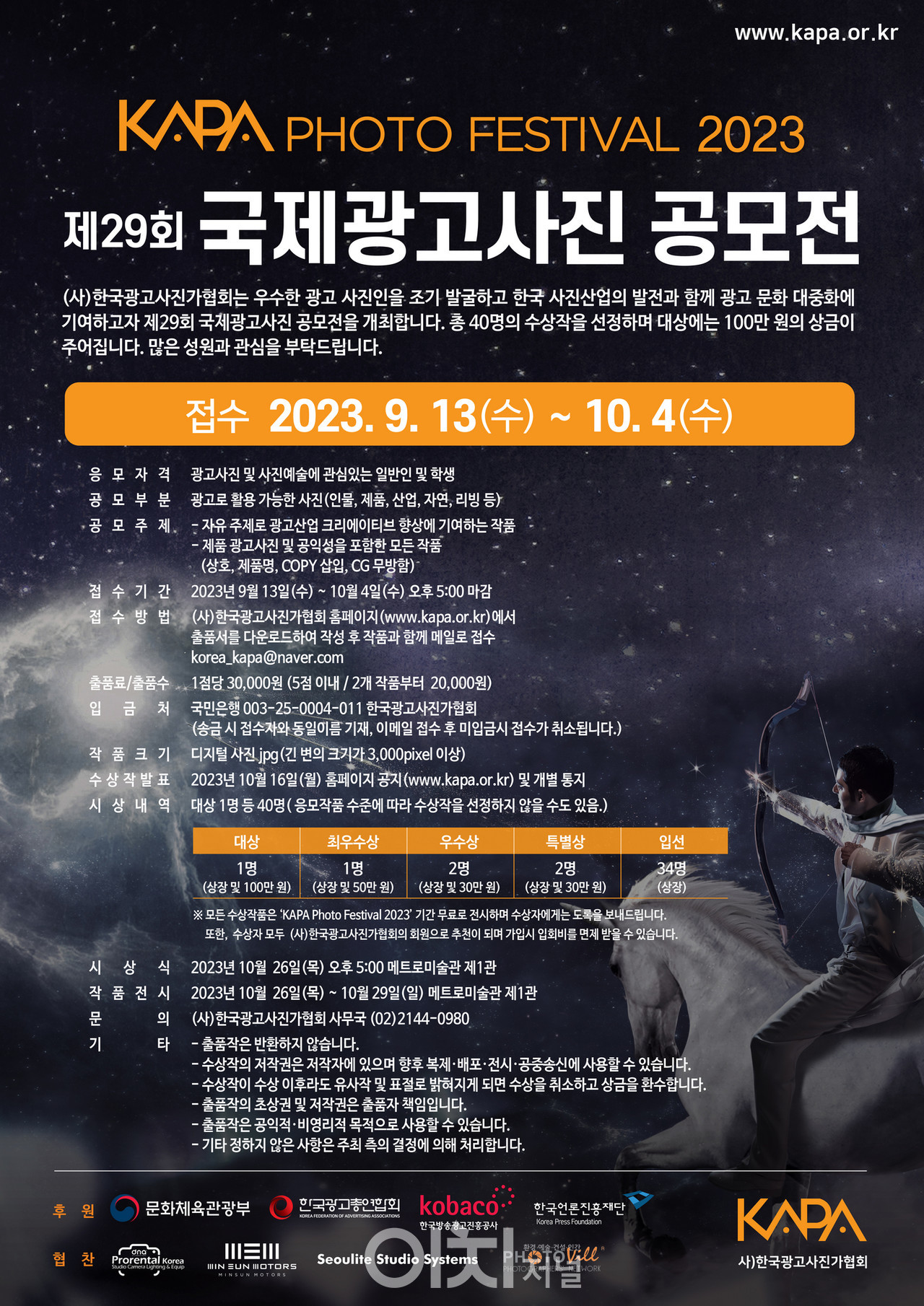 사단법인 한국광고사진가협회(이하 KAPA, 회장 : 심현준)는 오는 10월 26일(목)부터 29일(일)까지 서울메트로미술관 1관(경복궁역)에서 KAPA Photo Festival 2023을 개최한다.