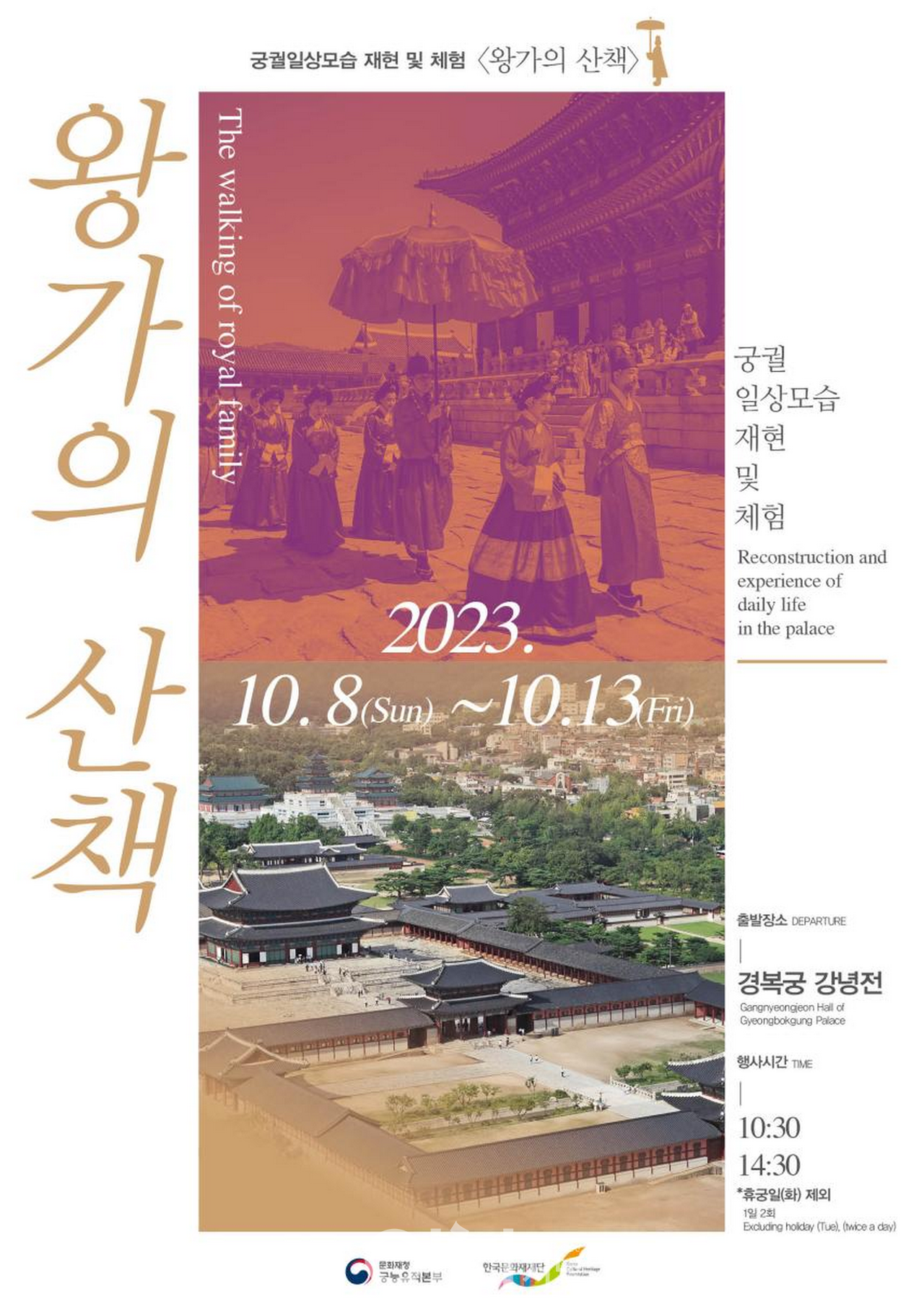 10월 8일부터 10월 13일까지 오전 10시 30분과 오후 2시 30분 하루 2회 경복궁(서울 종로구)에서 국왕과 왕비, 왕세자와 세자빈이 경회루, 향원정 등 경복궁의 대표 장소를 산책하는 모습을 재현한 ‘궁궐일상모습 재현 및 체험 – 왕가의 산책’ 행사를 개최한다. (경복궁 휴궁일인 화요일 제외)