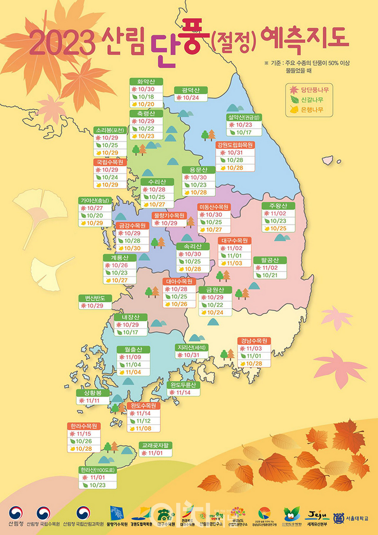 올 단풍 절정 시기는 지역과 수종에 따라 다소 차이가 있겠으나, 대부분 10월 하순부터 11월 초로 예상되며, 수종별 단풍 절정 시기의 평균일은 당단풍나무(10월 26일), 신갈나무(10월 26일), 은행나무(10월 28일)로 분석되었다.