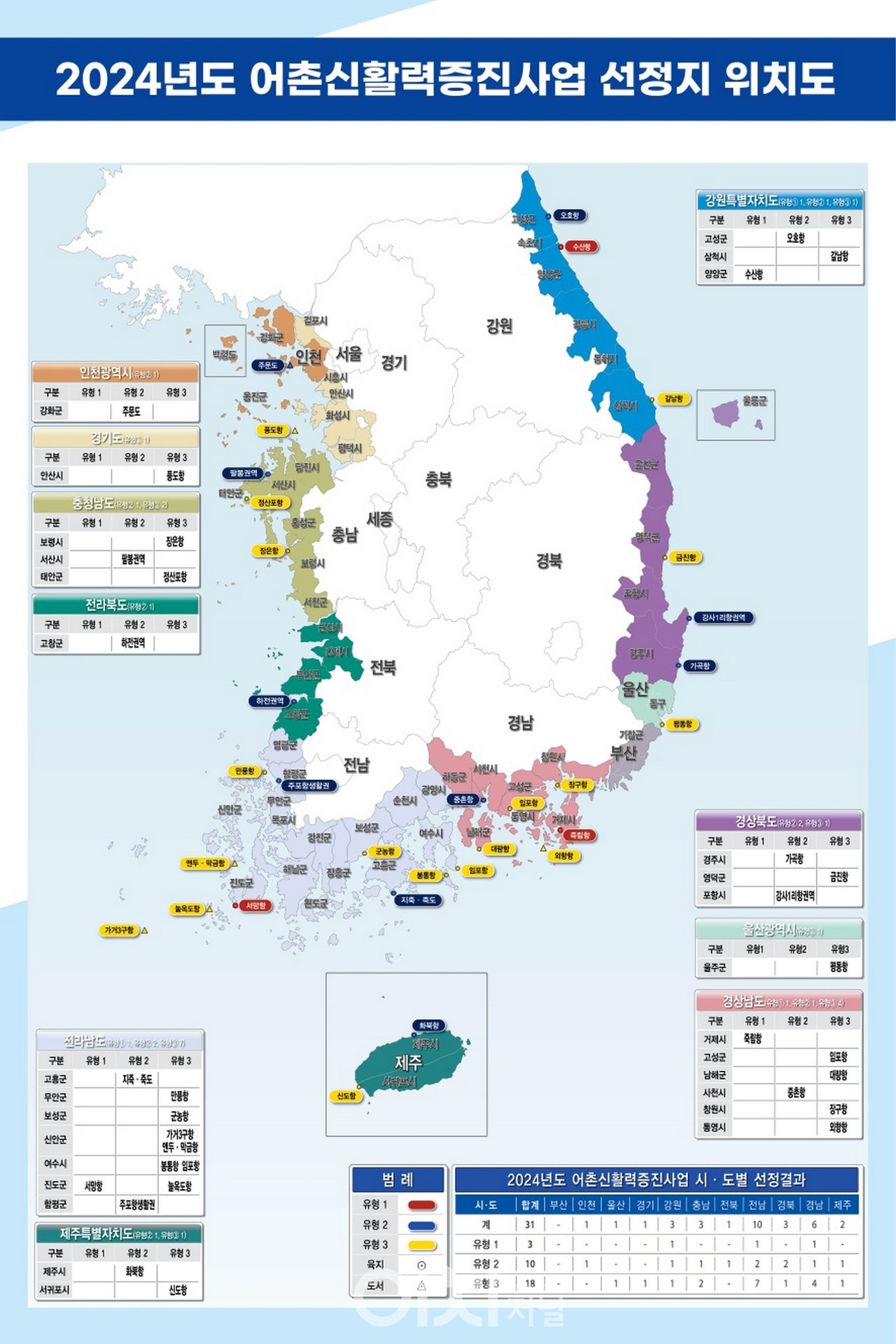 해양수산부(장관 강도형)는 1월 9일(화) ‘2024년도 어촌신활력증진 사업’ 대상지 31개소를 선정하여 발표하였다.