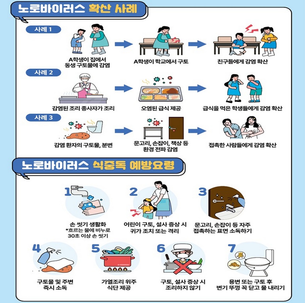 또한, 사람 간 접촉으로 전파되는 것을 예방하기 위해서는 ▲비누를 사용해 흐르는 물에 30초 이상 손씻기 ▲의심 증상 발생 때 조리 참여 금지 ▲세척·소독 등 조리 시 위생관리 등 예방수칙을 준수해야 한다.