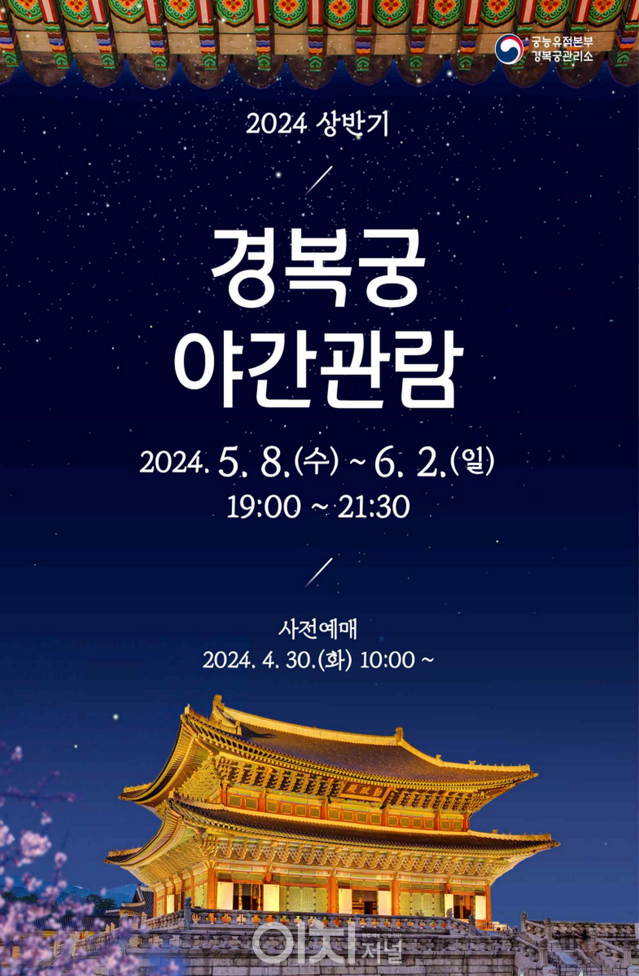 문화재청 궁능유적본부 경복궁관리소(소장 고정주)는 오는 5월 8일부터 6월 2일까지 「2024년 상반기 경복궁 야간관람」을 운영하며, 4월 30일 오전 10시부터 온라인 예매(선착순)를 시작한다.