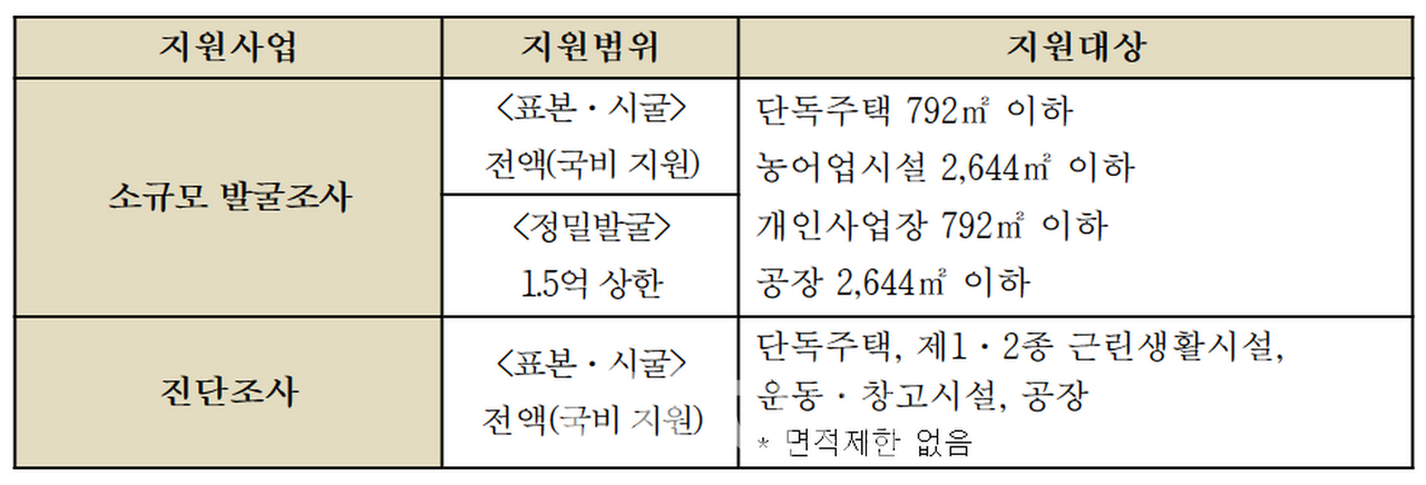 일정 규모 이하의 건설공사 시 매장유산 조사를 국가가 지원하여 경제적 부담을 줄이고 매장유산을 효과적으로 보호·관리하기 위해 국가유산청은 ‘국비지원 발굴조사 사업’을 시행해오고 있으며, 단독주택, 농어업시설 등 소규모 건설공사에 한해 발굴조사 비용을 지원하던 것을 확대시켜 지난해부터는 제1·2종 근린생활시설과 운동시설 같은 생활밀접형 건설공사에 대하여 면적에 상관없이 진단조사(표본·시굴) 비용을 전액 지원해오고 있다.