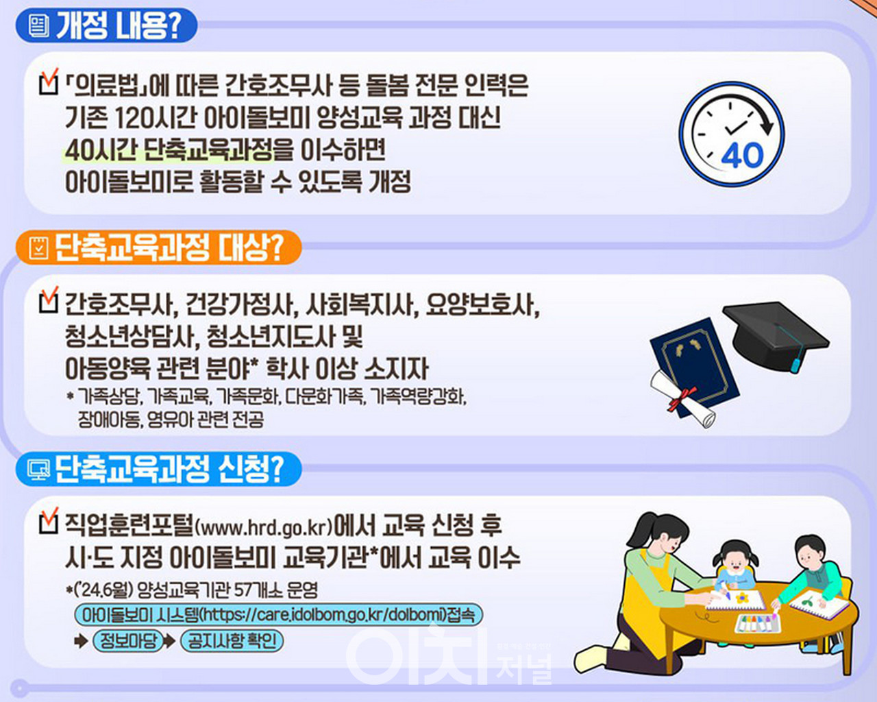 이는 아이돌보미 양성을 확대해 적시에 돌봄 서비스를 제공하기 위해 유사자격 소지자에 대해 교육 과정을 단축 운영하도록 하는 아이돌봄 지원법 시행규칙과 아이돌보미 양성 및 보수 교육과정 고시를 개정함에 따른 것이다.