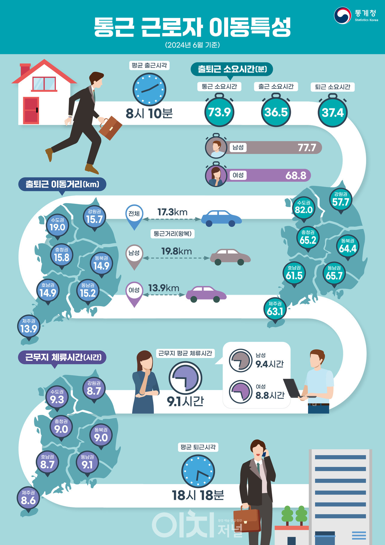 2024년 6월을 기준으로 통근 근로자의 평균 출근 시간은 오전 8시 10분, 퇴근 시간은 오후 6시 18분으로 나타났다. 특히 남성은 여성보다 평균 21분 일찍 출근했고, 연령이 높을수록 출퇴근 시간이 앞당겨지는 경향이 두드러졌다. 하루 평균 73.9분 동안 17.3km를 이동하며, 수도권 거주자가 가장 긴 시간을 통근에 쏟았다.