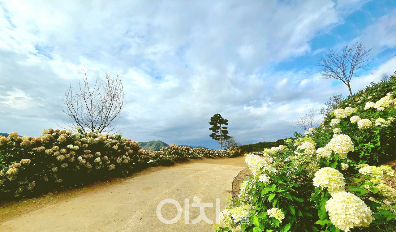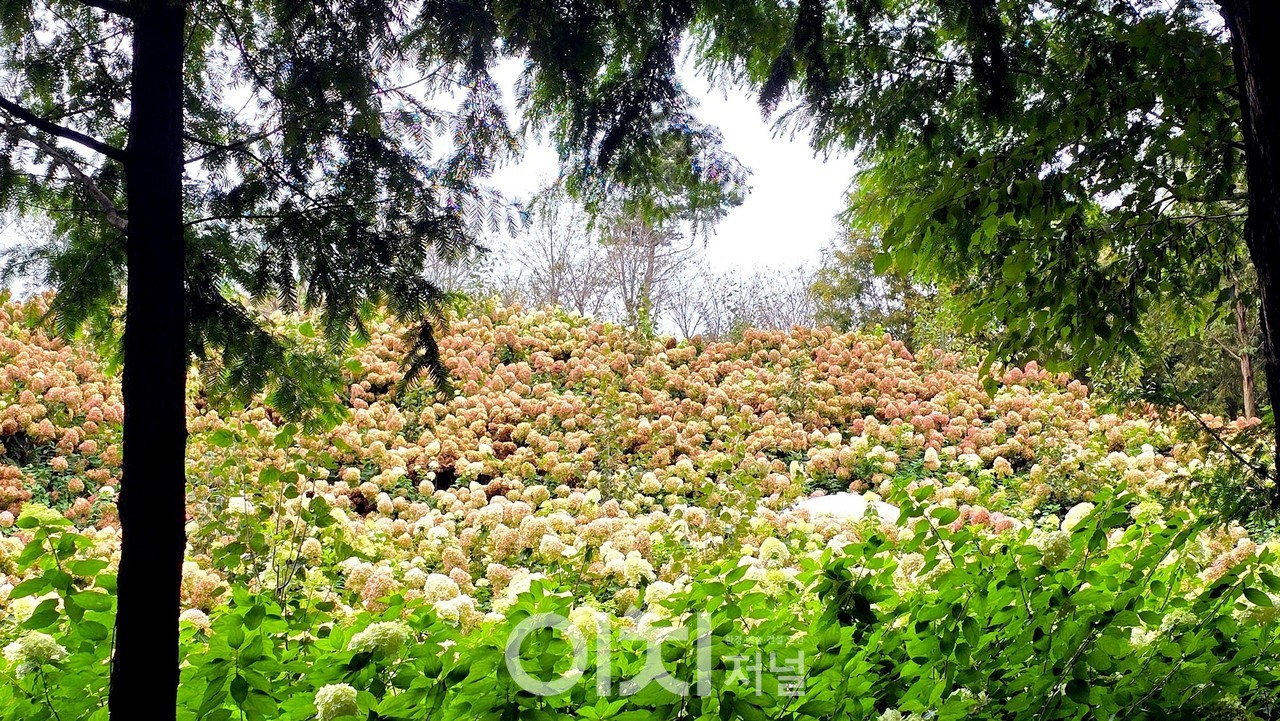 하얀색, 연분홍 수국들이 층층이 쌓여 만들어낸 풍경은 한 폭의 그림 같다. 특히 햇살이 낮게 깔리는 오후 시간대, 언덕 아래에서 위를 바라보면 수국은 마치 물결처럼 일렁인다. 카메라 셔터가 멈추지 않는 이유다. 정원 일부는 아직 조성 중이지만, 곳곳에 세워진 조형물과 나무그늘 덕분에 방문객들은 사계절 각기 다른 느낌의 풍경을 즐긴다.