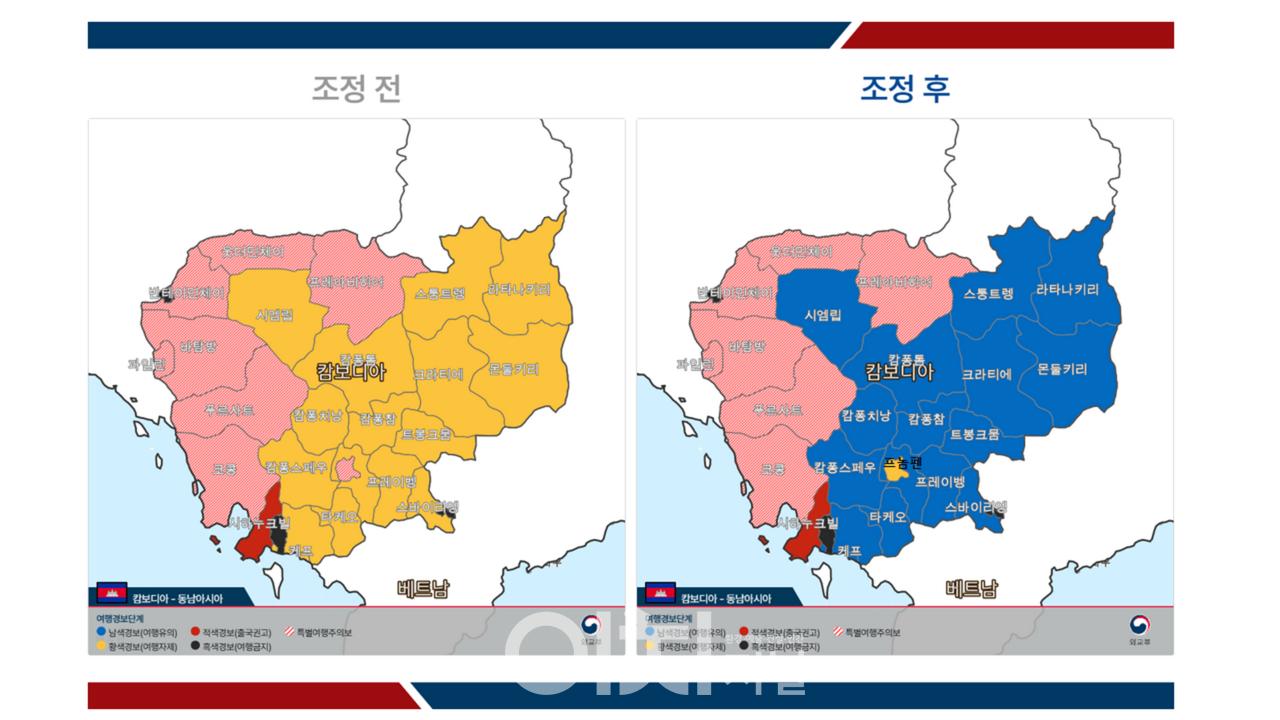 외교부는 “최근 캄보디아 정부의 단속 강화와 양국 간 공조로 일부 지역 상황은 호전됐지만, 스캠범죄는 여전히 위험도가 높은 만큼 경계가 필요하다”며 “현지 상황을 면밀히 모니터링하며 추가 조정 여부를 지속 검토하겠다”고 밝혔다.